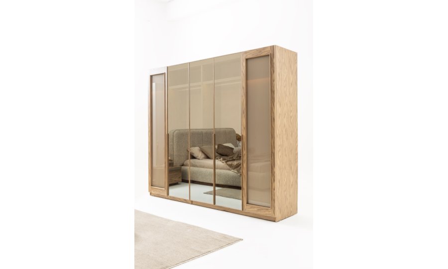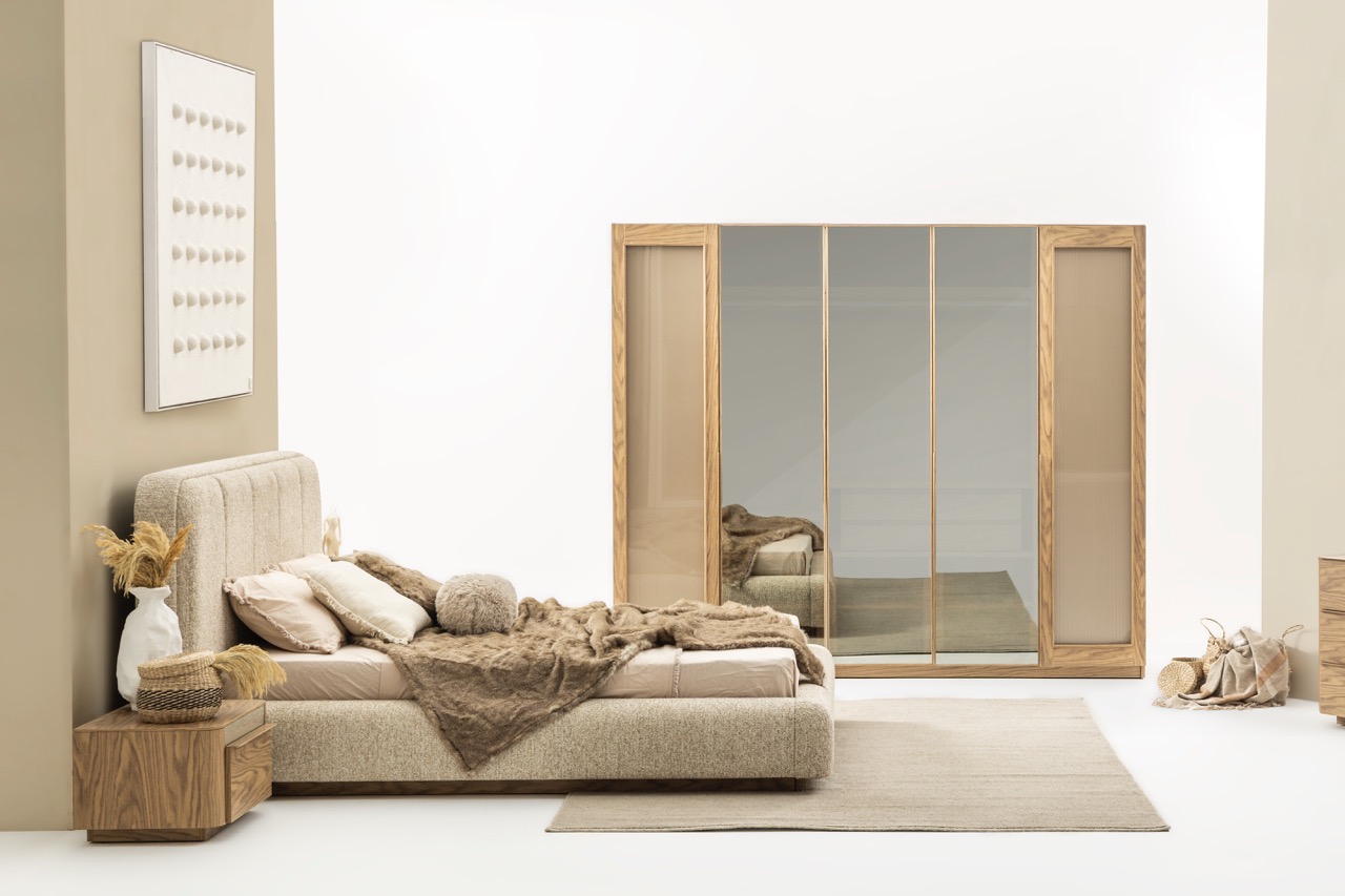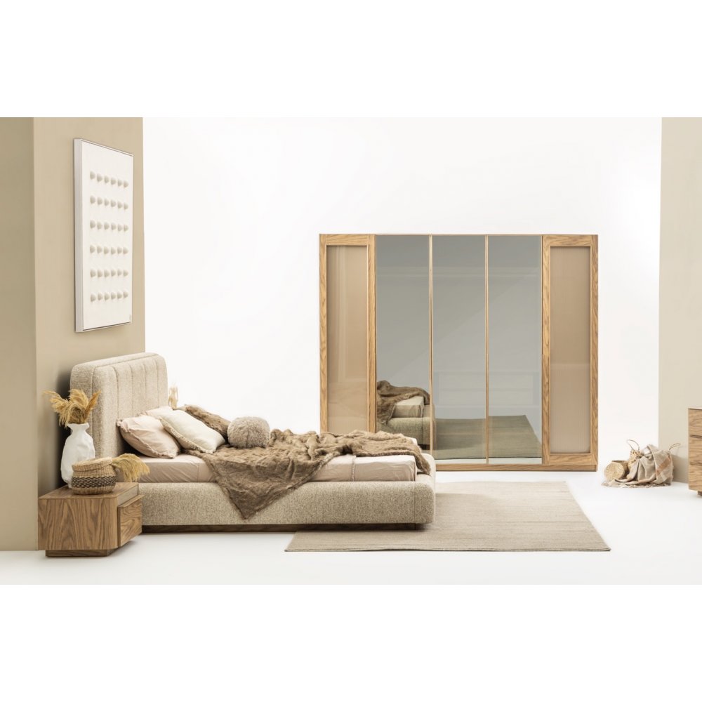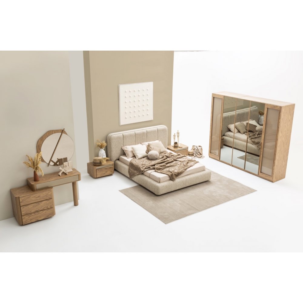1 adet iki kapaklı ahşap modül, 1 adet üç kapaklı ahşap modül ,1 adet karyola ,1 adet şifonyer (aynalı) ve 2 adet komodinden oluşmaktadır. Baza sistemi opsiyonel olarak satışa sunulmuştur