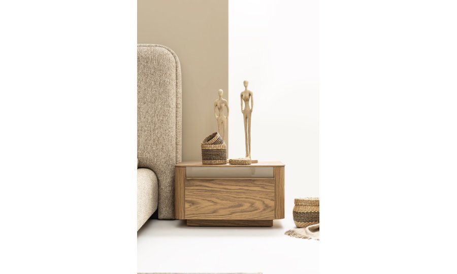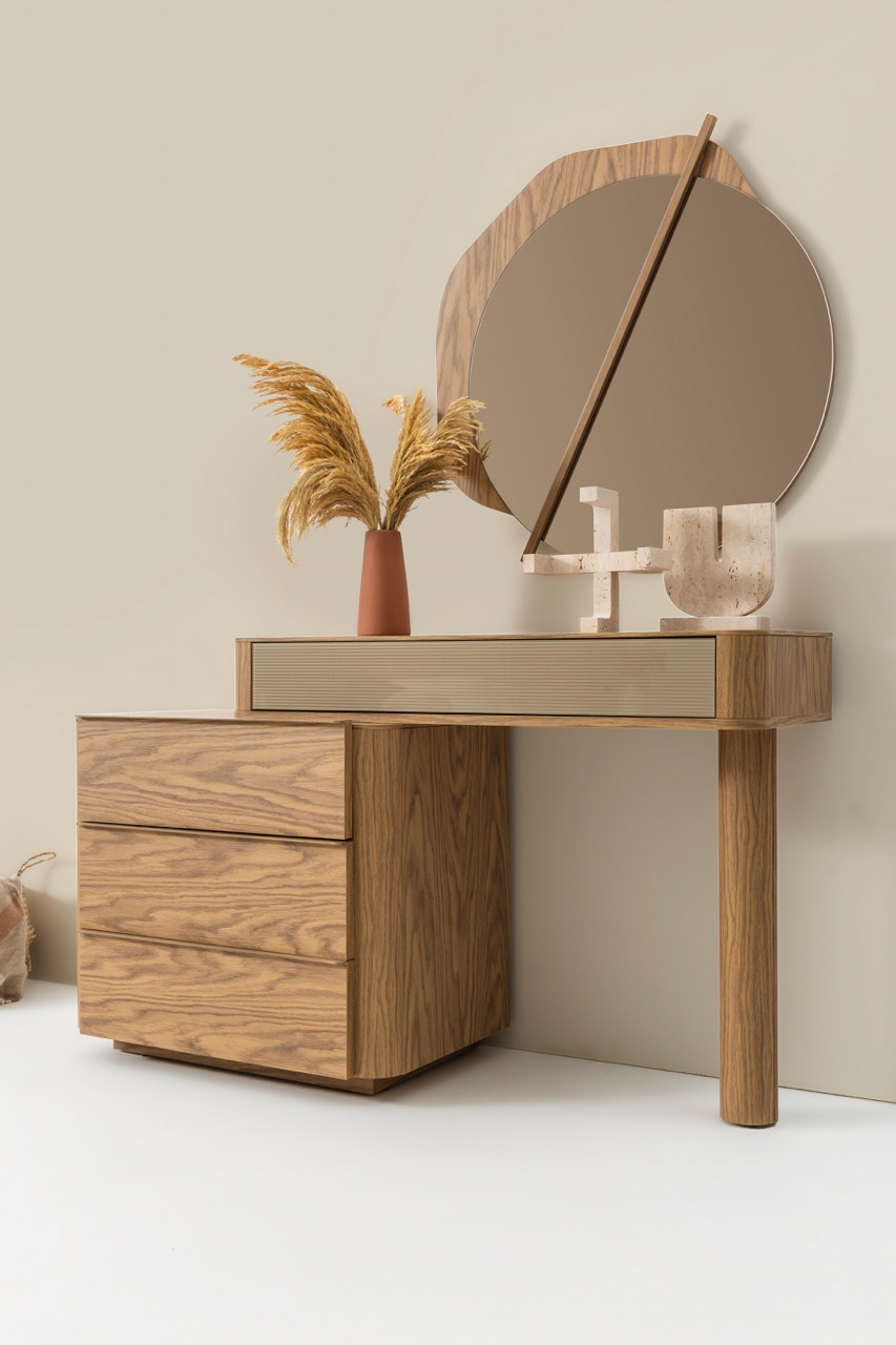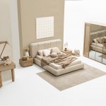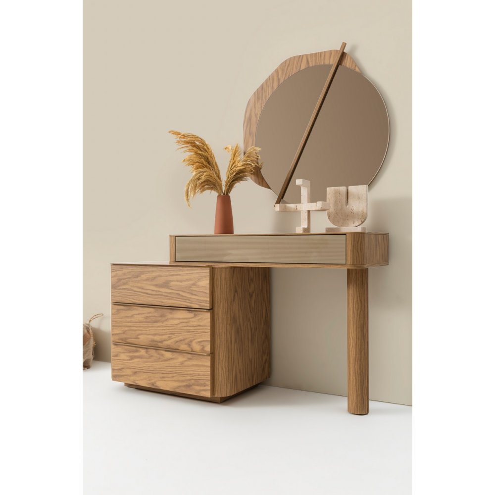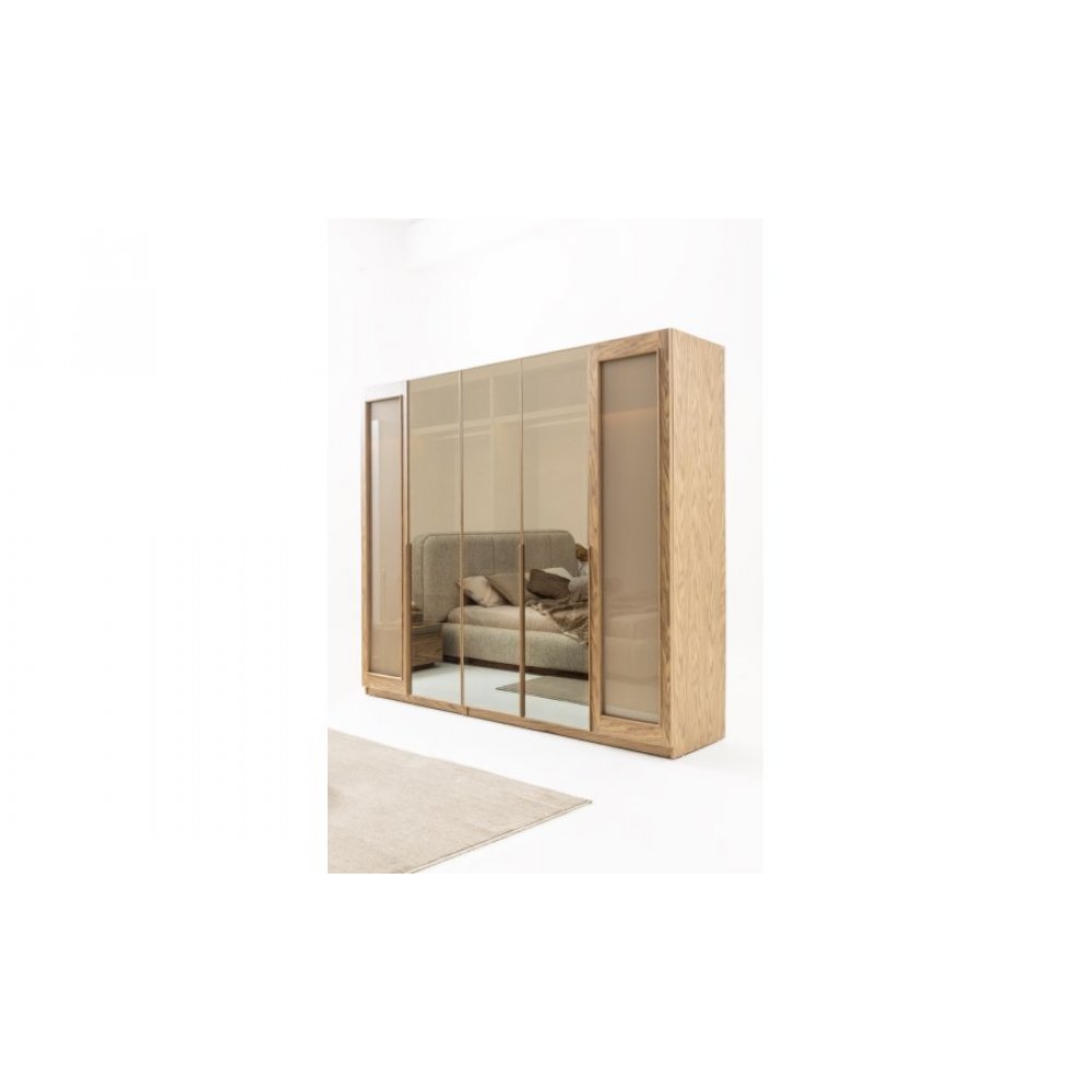 1 adet iki kapaklı ahşap modül, 1 adet üç kapaklı ahşap modül ,1 adet karyola ,1 adet şifonyer (aynalı) ve 2 adet komodinden oluşmaktadır. Baza sistemi opsiyonel olarak satışa sunulmuştur