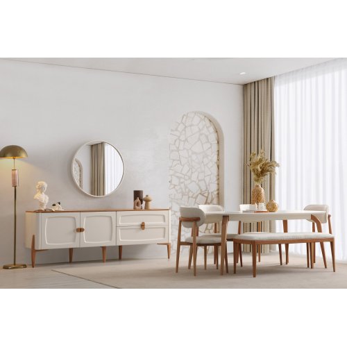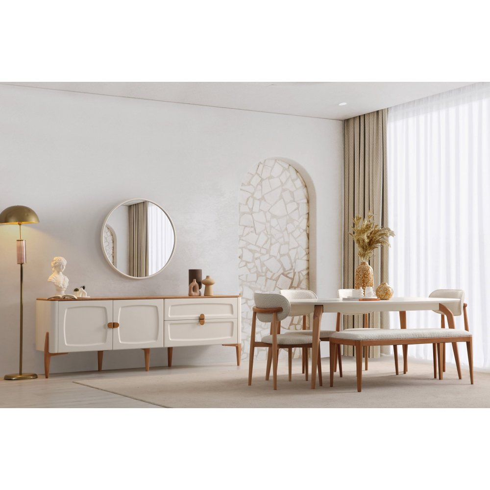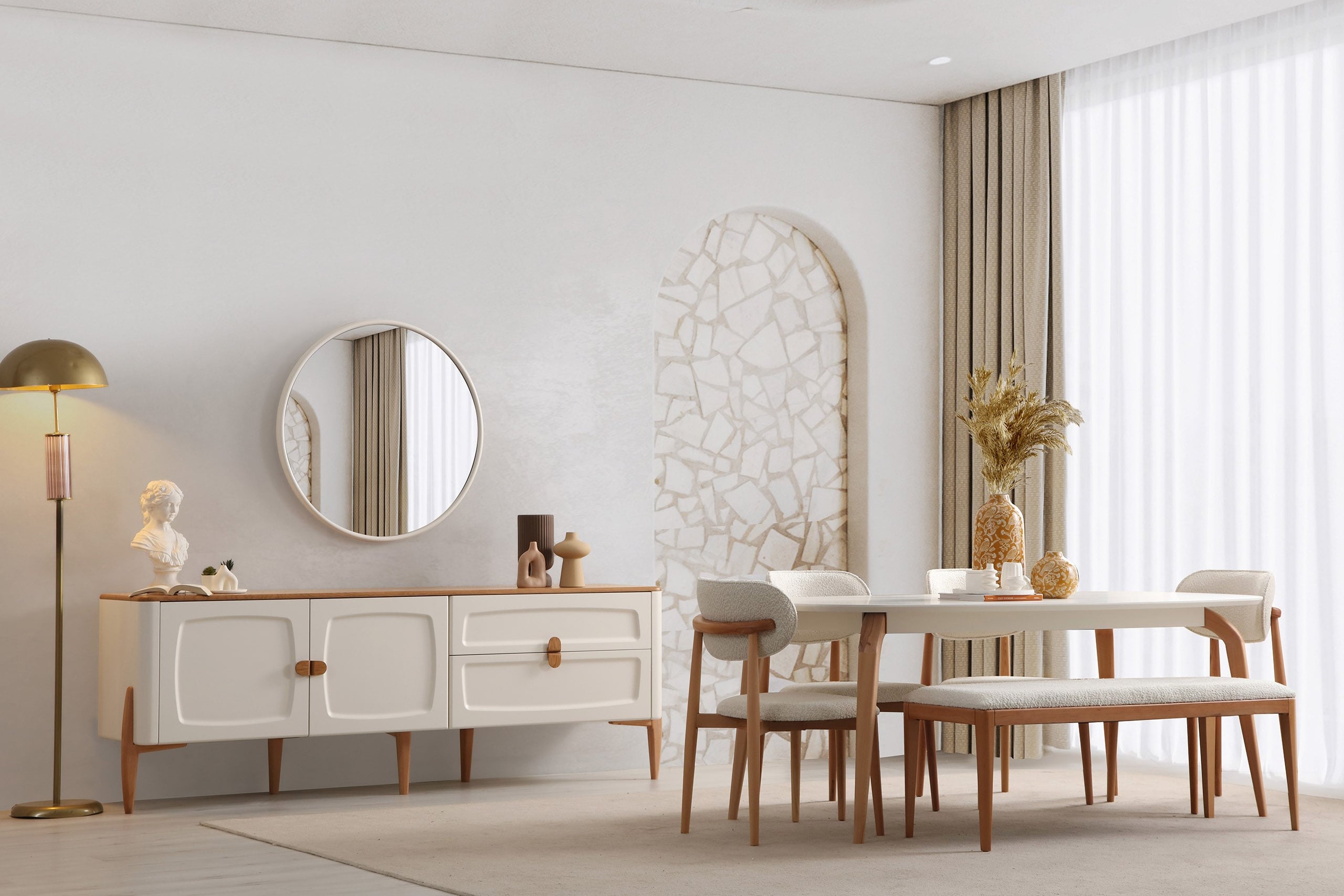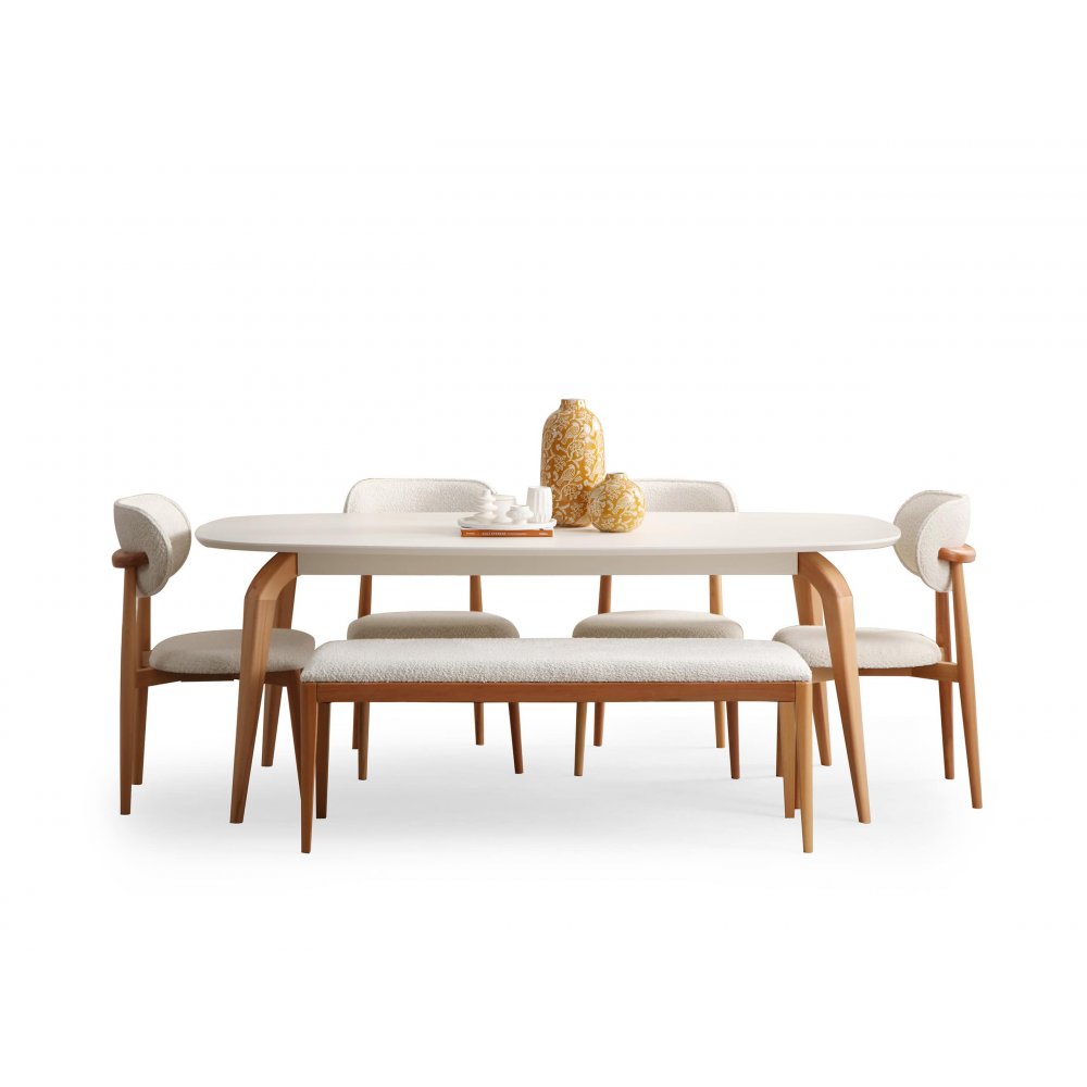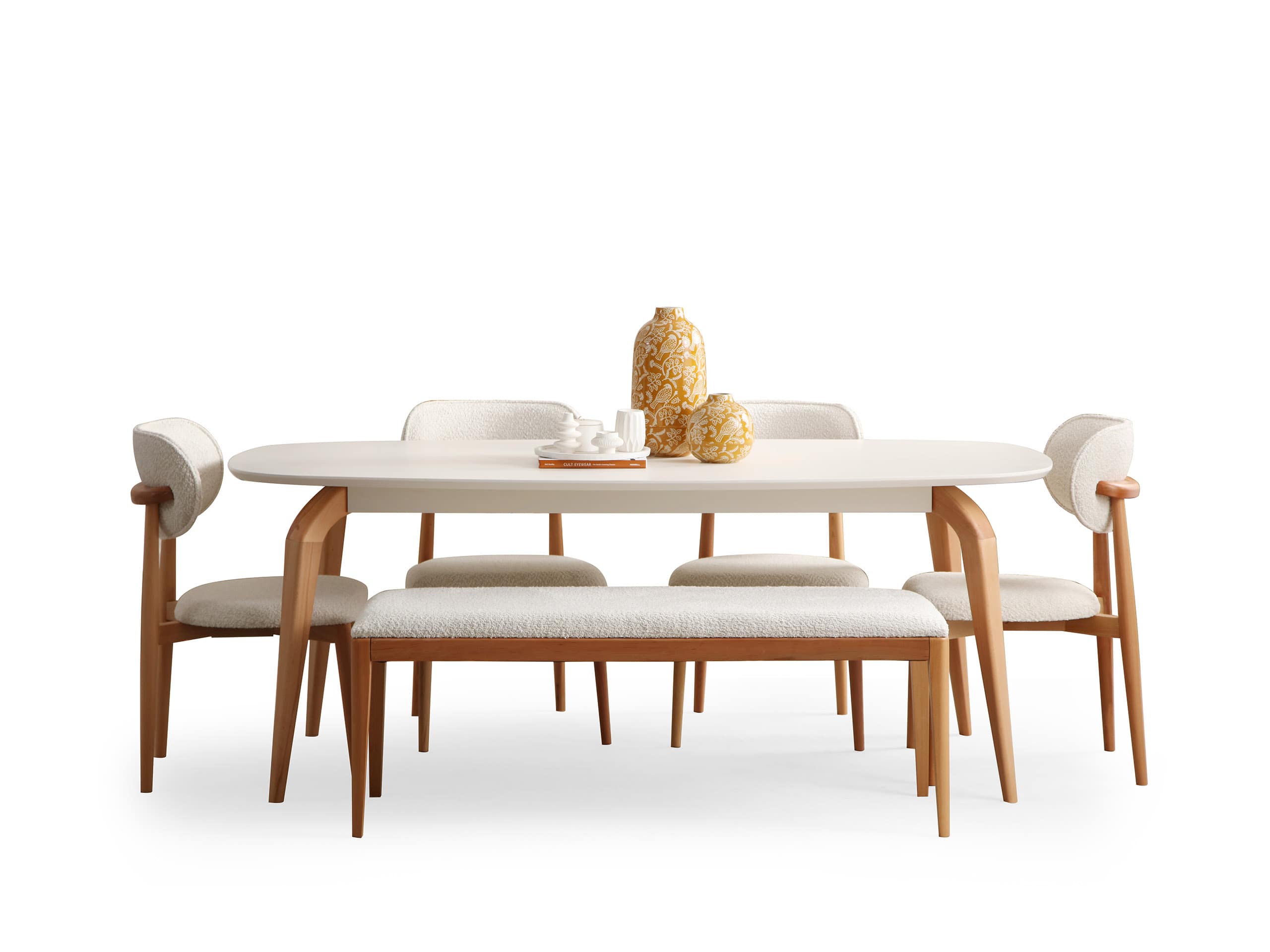 Yemek masasında boyalı üst yüzey, isteğe bağlı olarak meşe sıvamalı tabla sipariş edebilme imkânı