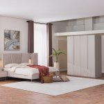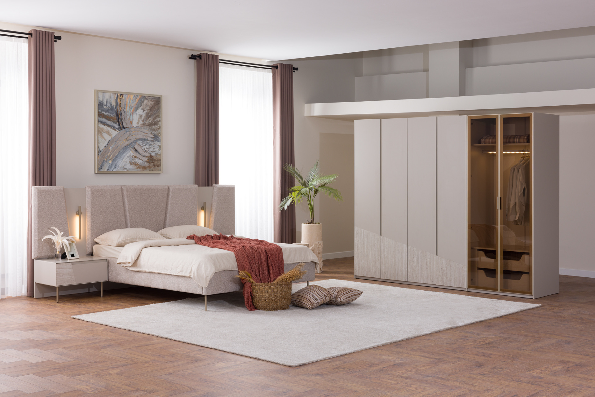 1ad. 4kapaklı dolap, 1ad. 2 kapaklı reflekte camlı dolap, 1ad. şifonyer ve ayna, 2ad. komodin ve 1ad. karyoladan oluşmaktadır. Baza sistemi, puf, 1 kapaklı reflekte camlı dolap opsiyonel olarak satışa sunulmuştur.