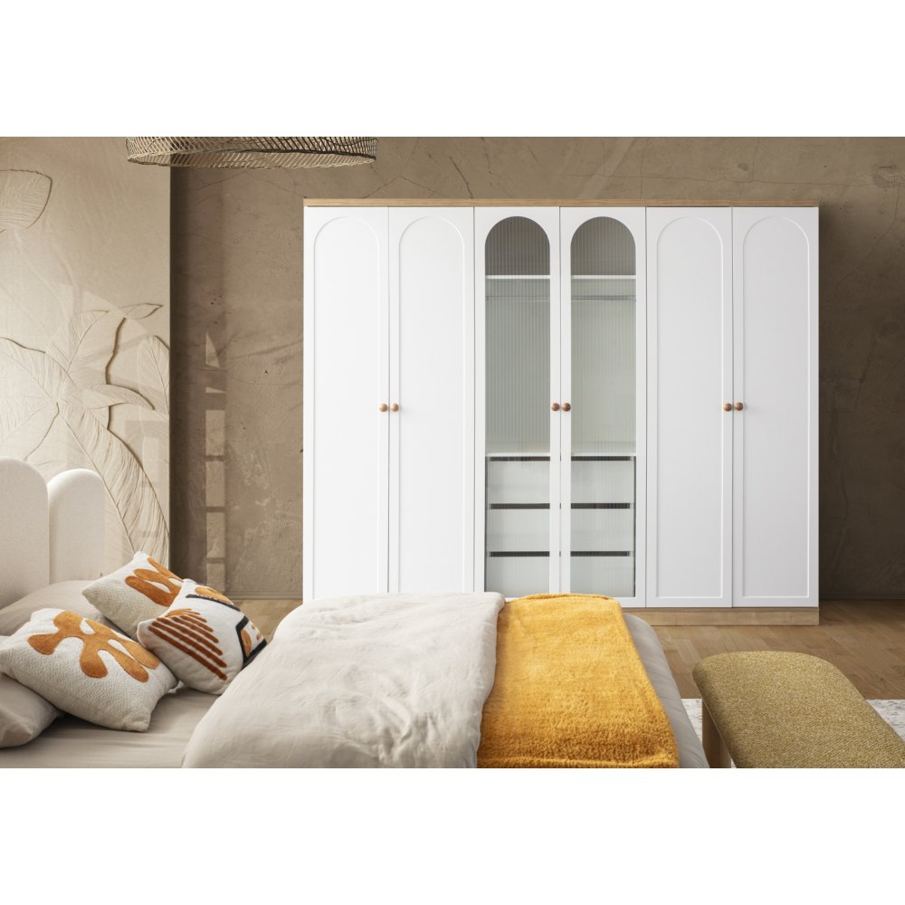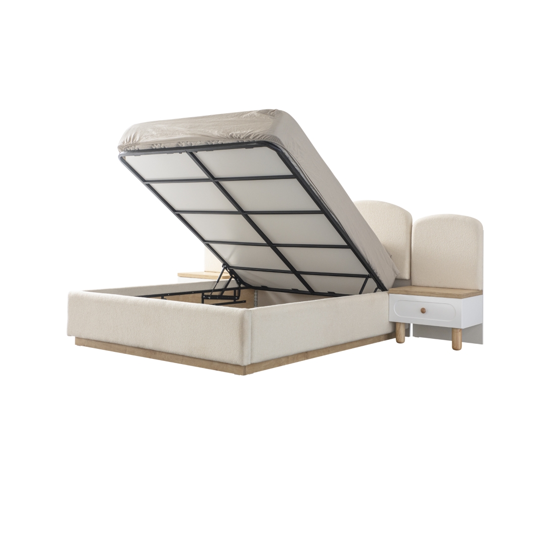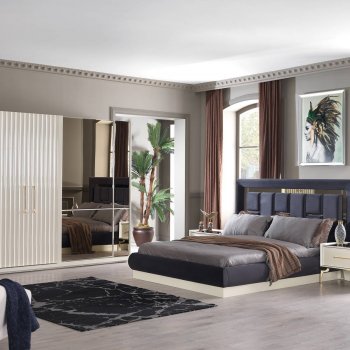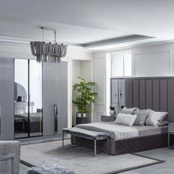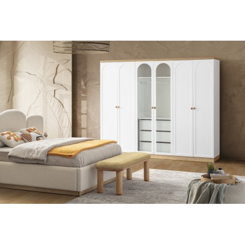 1ad. 6 kapaklı dolap, 1ad. bazalı karyola, 1ad. şifonyer ve 2ad. komodinden oluşmaktadır. Bench ve Puf opsiyonel olarak satışa sunulmuştur.