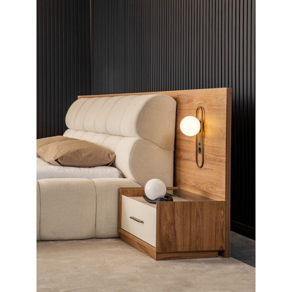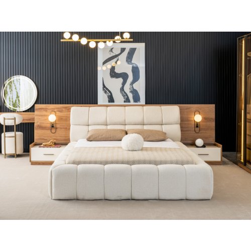 1ad. 2kapaklı çekmeceli dolap, 1ad. 2kapaklı pantolonluklu dolap, 1ad. 2kapaklı raflı dolap, 1ad.şifonyer ve aynası,1ad.160x200 bazalı karyola, 2ad.komodin ve 2 ad. komodin panosundan oluşmaktadır. Köşe dolap, tekli raflı dolap,puf ve 180x200 bazalı karyola opsiyonel olarak satışa sunulmaktadır.